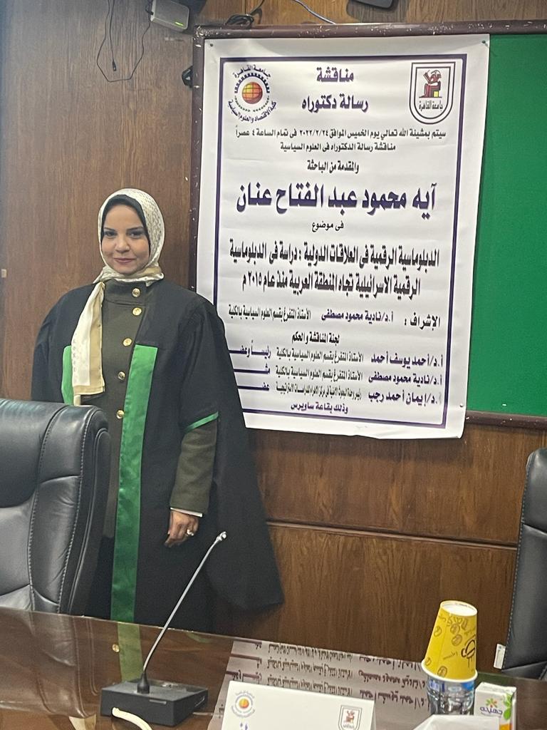 حصلت آية محمود عبدالفتاح عنان الباحثة بجامعة القاهرة، على درجة الدكتوراه بتقدير امتياز مع مرتبة الشرف، في الرسالة المقدمة منها بعنوان (الدبلوماسية الرقمية في العلاقات الدولية.. الدبلوماسية الرقمية الإسرائيلية تجاه المنطقة العربية منذ عام 2015)، والتي تعد الرسالة الأولى من نوعها في تناول الدبلوماسية الرقمية، ولا سيما الإسرائيلية.
