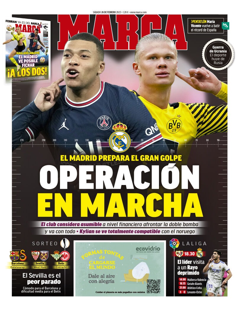 عنونت ماركا بـ ريال مدريد يستعد لعملية انقلاب كبيرة وهي جارية، وذلك في إشارة منها بأن إدارة النادي الملكي تراه مستعدًا ماليًا، لمواجهة التدعيم المزدوج بضم هالاند ومبابي.