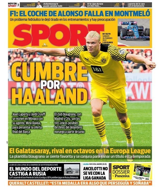 عنونت سبورت في غلافها اليوم، بـ قمة هالاند، وذلك في إشارة من الصحيفة إلى أن هناك سباق من جانب 5 أندية أوروبية كبرى، لضم هالاند في الفترة المقبلة.