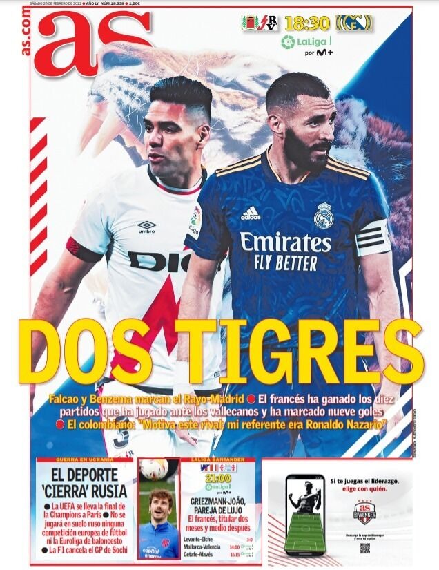 سلطت الصحيفة الضوء على مواجهة بنزيما وفالكاو في لقاء ريال مدريد ورايو فاليكانو، حيث قالت في غلافها: اثنين من النمور.. بنزيما حقق الفوز بالعشر مباريات التي لعبها ضد رايو فايكانو، كما أن فالكاو لديه حافز بالمباريات الكبيرة.
