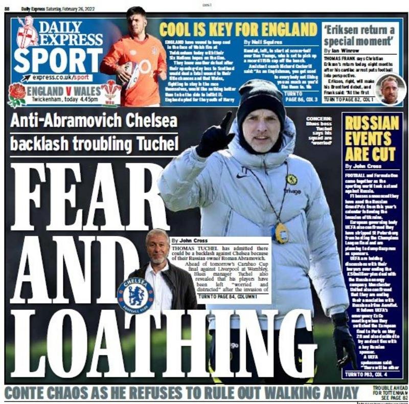 عنونت إكسبريس في غلافها، اليوم، بـ خوف واشمئزاز، وذلك بعد الوضع العام في مجلس إدارة تشيلسي عقب اقتراب المستثمرين من سحب أسهمهم في النادي بعد حرب روسيا على أوكرانيا، وذلك بسبب ملكية رومان أبراموفيتش للنادي.