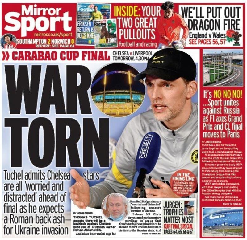 عنونت ميرور في غلافها اليوم، بـ حرب ممزقة، وذلك في إشارة إلى الوضع الحالي الذي تعيشه غرف ملابس فريق تشيلسي، حيث أشارت الصحيفة إلى أن توخيل أوضح لـ لاعبيه أن الوضع الحالي مُقلق للجميع بعد الحرب وتهديد مستقبل أبراموفيتش.
