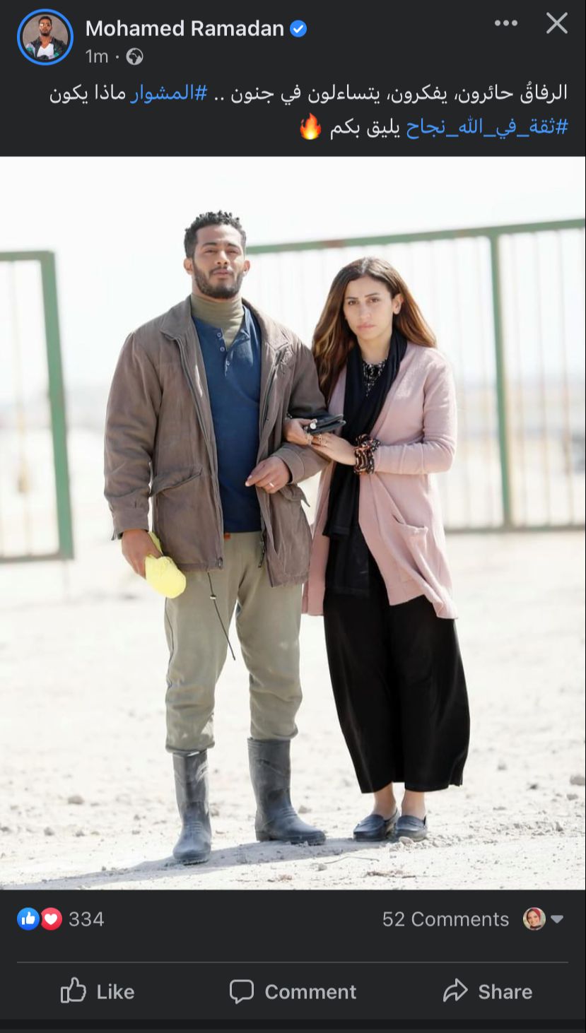 ونشر محمد رمضان، صورة تجمعه بالفنانة دينا الشربيني عبر حسابه الشخصي بموقع تبادل الصور والفيديوهات القصيرة انستجرام، وكتب قائلًا: الرفاق حائرون..يفكرون..يتساءلون في جنون..المشوار ماذا يكون..ثقة في الله نجاح يليق بكم.