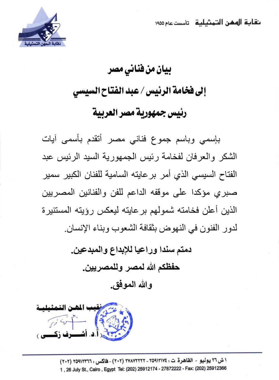 وجاء في البيان كالتالي: بإسمي من فناني مصر إلى فخامة الرئيس عبد الفتاح السيسي، رئيس جمهورية مصر العربية، باسمي وباسم جموع فناني مصر، أتقدم بأسمى آيات الشكر والعرفان لفخامة رئيس الجمهورية، السيد الرئيس عبد الفتاح السيسي، الذي أمر برعايته السامية للفنان الكبير سمير صبري.