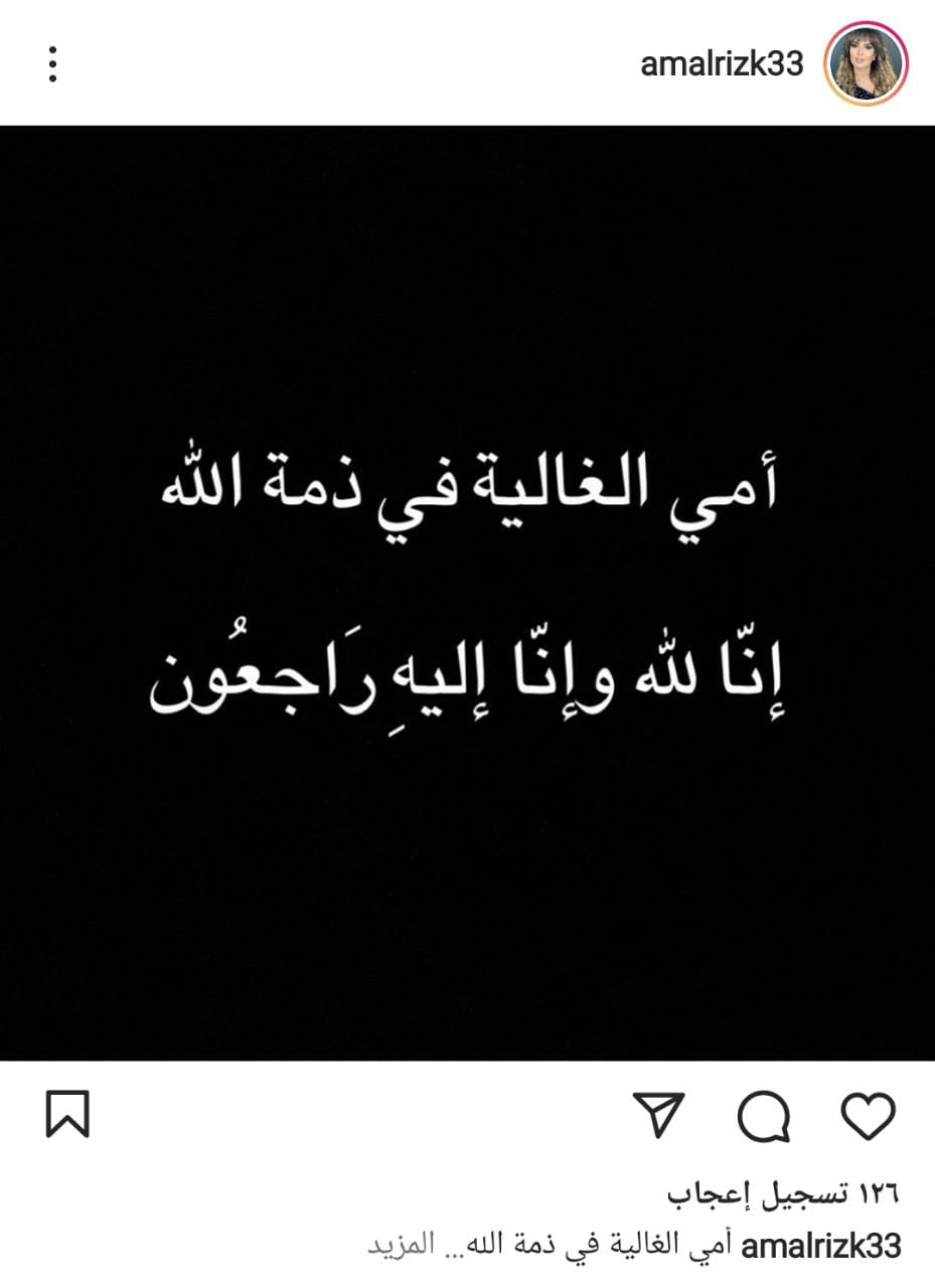 وحرصت أمل رزق على نعى والدتها الراحلة، حي كتبت منشورًا، عبر حسابها الشخصي بموقع تبادل الصور والفيديوهات القصرة انستجرام، قالت فيه: أمي الغالية في ذمة الله.. إنا لله وإنا إليه راجعون.