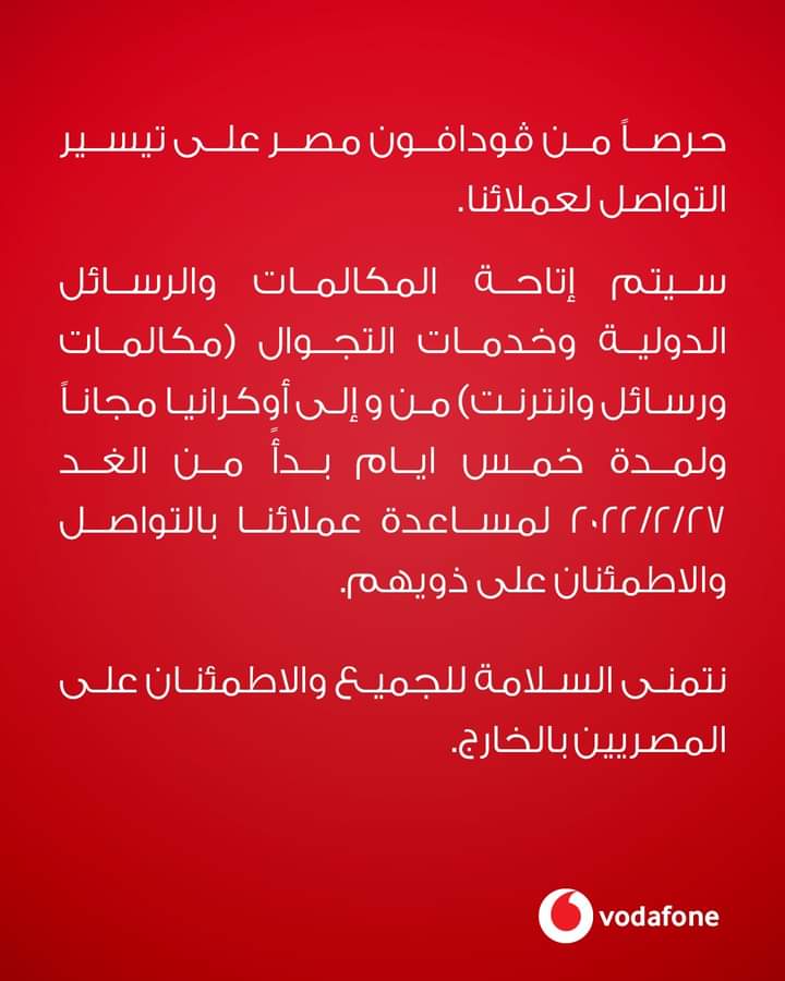 أعلنت شركة فوادفون مصر عن إتاحة المكالمات والرسائل الدولية، وخدمات التجوال، مكالمات ورسائل وانترنت، من وإلى أوكرانيا مجانا، ولمدة خمس أيام، بدءا من الغد.