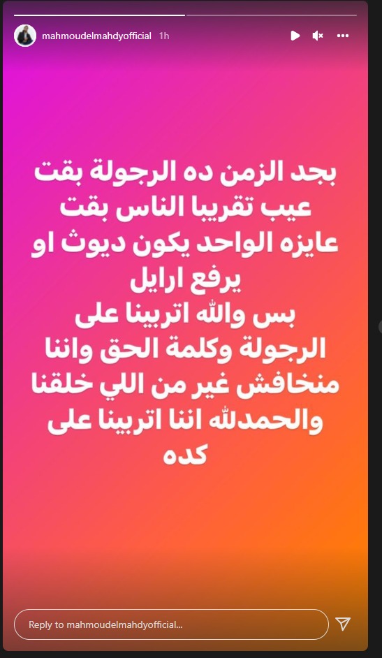 وكتب محمود المهدي عبر استوري على حسابه الرسمي بموقع تبادل الصور والفيديوهات انستجرام: بجد الزمن دا الرجولة بقت عيب تقريبا والناس بقت عايزة الواحد يكون ديوث أو يرفع أرايل.