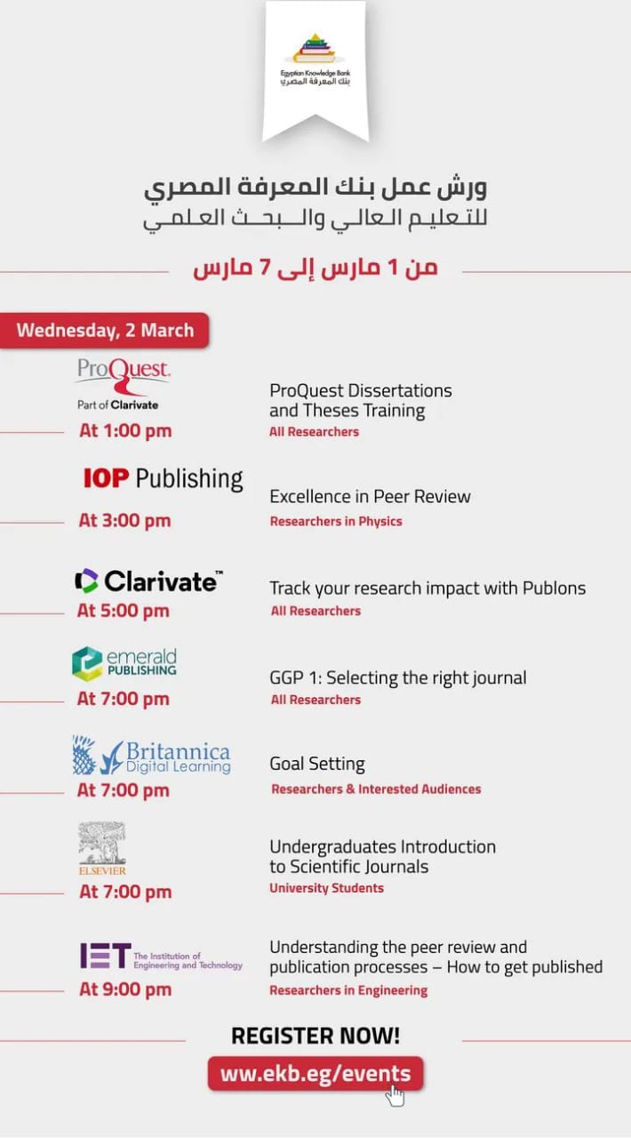 أعلنت وزارة التربية والتعليم والتعليم الفني الجدول الأسبوعي لورش عمل بنك المعرفة المصري، وذلك للطلاب الجامعيين والباحثين وأعضاء هيئة التدريس من الفترة 1 مارس حتى 7 من نفس الشهر لعام 2022.
