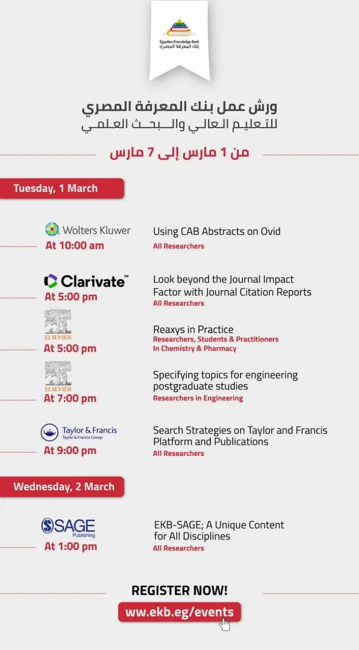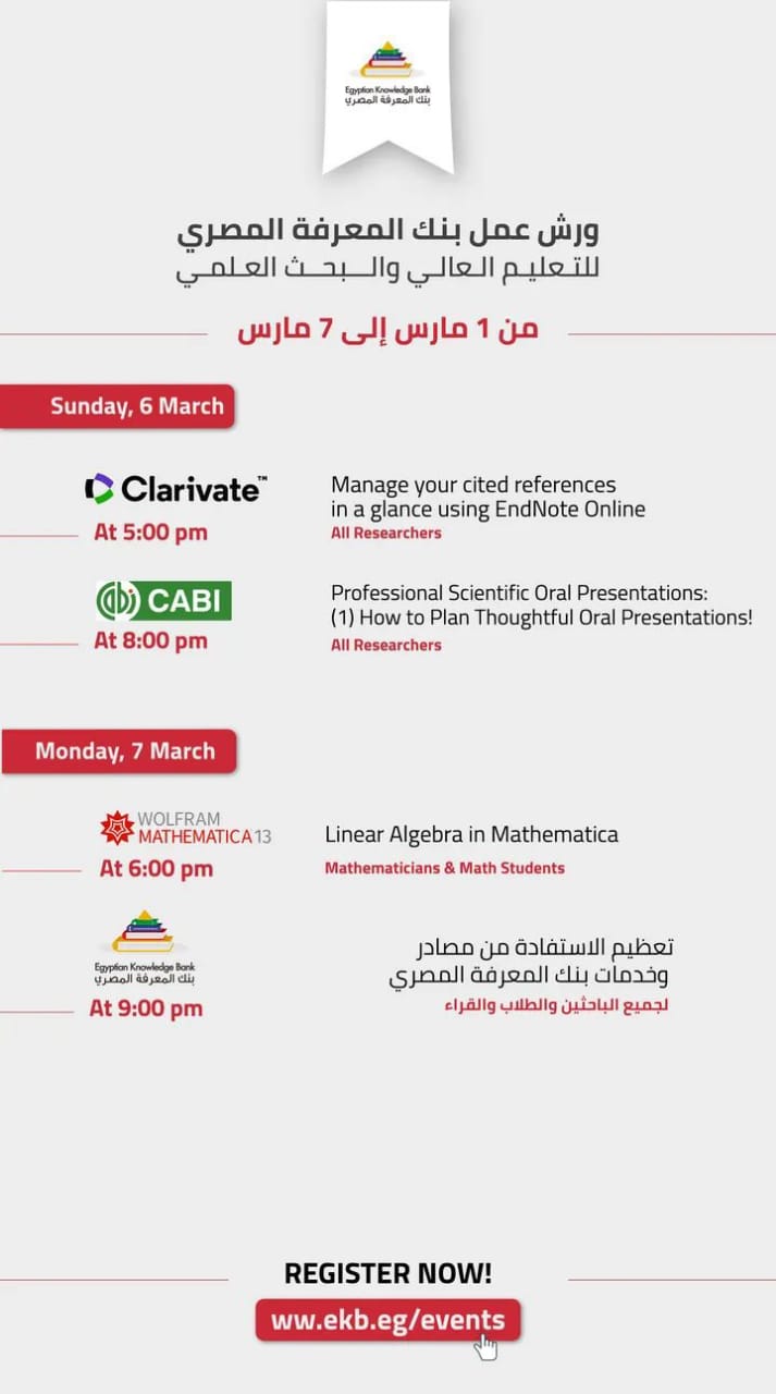 وكتب بنك المعرفة على موقع التواصل الاجتماعي فيسبوك، منشورًا، جاء مضمونه: يمكنكم يا أعزاءنا التسجيل في جميع ورش عمل بنك المعرفة المصري من خلال هذا الرابط.