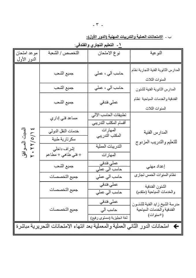 وأكدت الوزارة على عقد الامتحانات العملية للدبلومات الفنية بداية من 14 مايو 2022، لجميع الشعب والتخصصات الفنية في المدارس التجارية والفندقية والخدمات السياحية ومدارس التدريب المزدوج والإعداد المهني ومدرسة الشيخ زايد الفندقية نظام الخمس سنوات