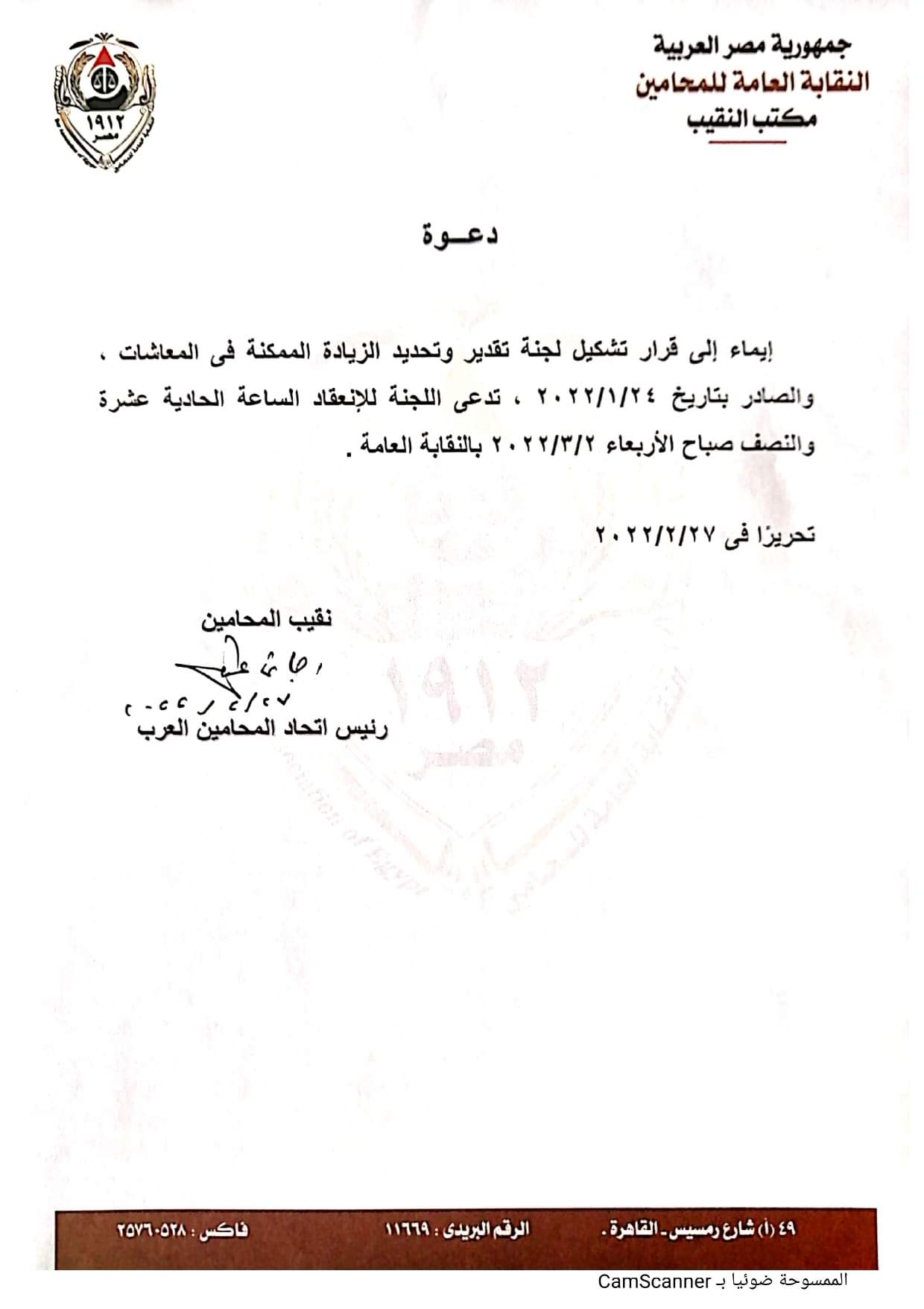 دعا رجائي عطية نقيب المحامين، لجنة تقدير وتحديد الزيادة الممكنة في المعاشات، للانعقاد، يوم الأربعاء المقبل الموافق 2 مارس 2022.