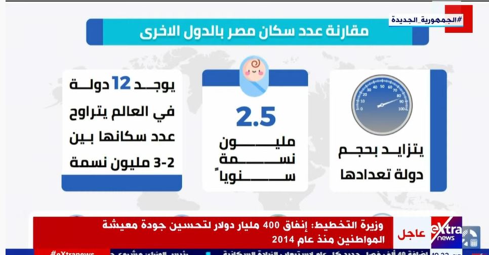 قالت الدكتورة هالة السعيد، وزيرة التخطيط والتنمية الاقتصادية، إن معدل الزيادة السكانية في مصر، يبلغ 2.5 مليون مولود جديد سنويًا.