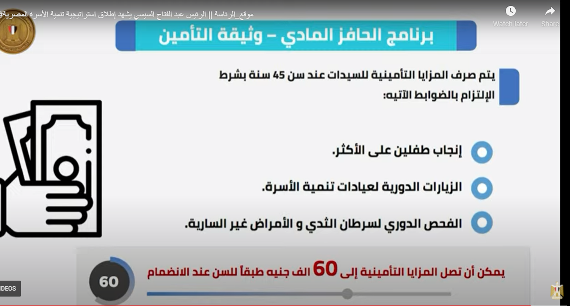 وواصلت وزيرة التخطيط والتنمية الاقتصادية، أن المشروع القومي لتنمية الأسرة المصرية تضم برنامج حوافز مالية مؤجلة للسيدات بشرط الالتزام بالضوابط التي تحقق أهداف المشروع، يشترط ألا يقل سن السيدات عن 21 عاما ولا يزيد على 61 عاما.