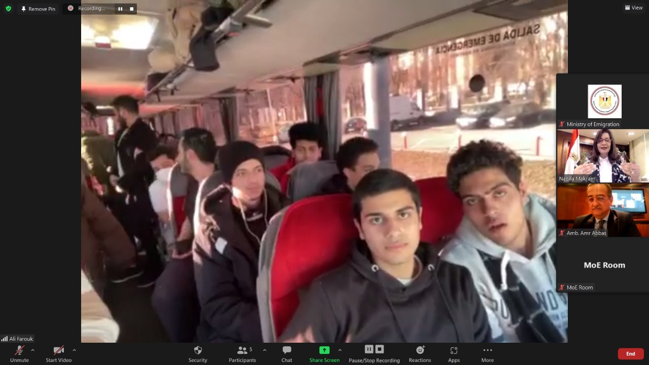 عقدت السفيرة نبيلة مكرم عبد الشهيد وزيرة الهجرة وشئون المصريين بالخارج، لقاء اليوم عبر تطبيق زووم، بمجموعة من الطلاب المصريين في العاصمة الأوكرانية كييف، خلال إجلائهم من أوكرانيا إلى بولندا، بعد تنسيق الجهود مع الخارجية المصرية وممثلي الجالية المصرية.