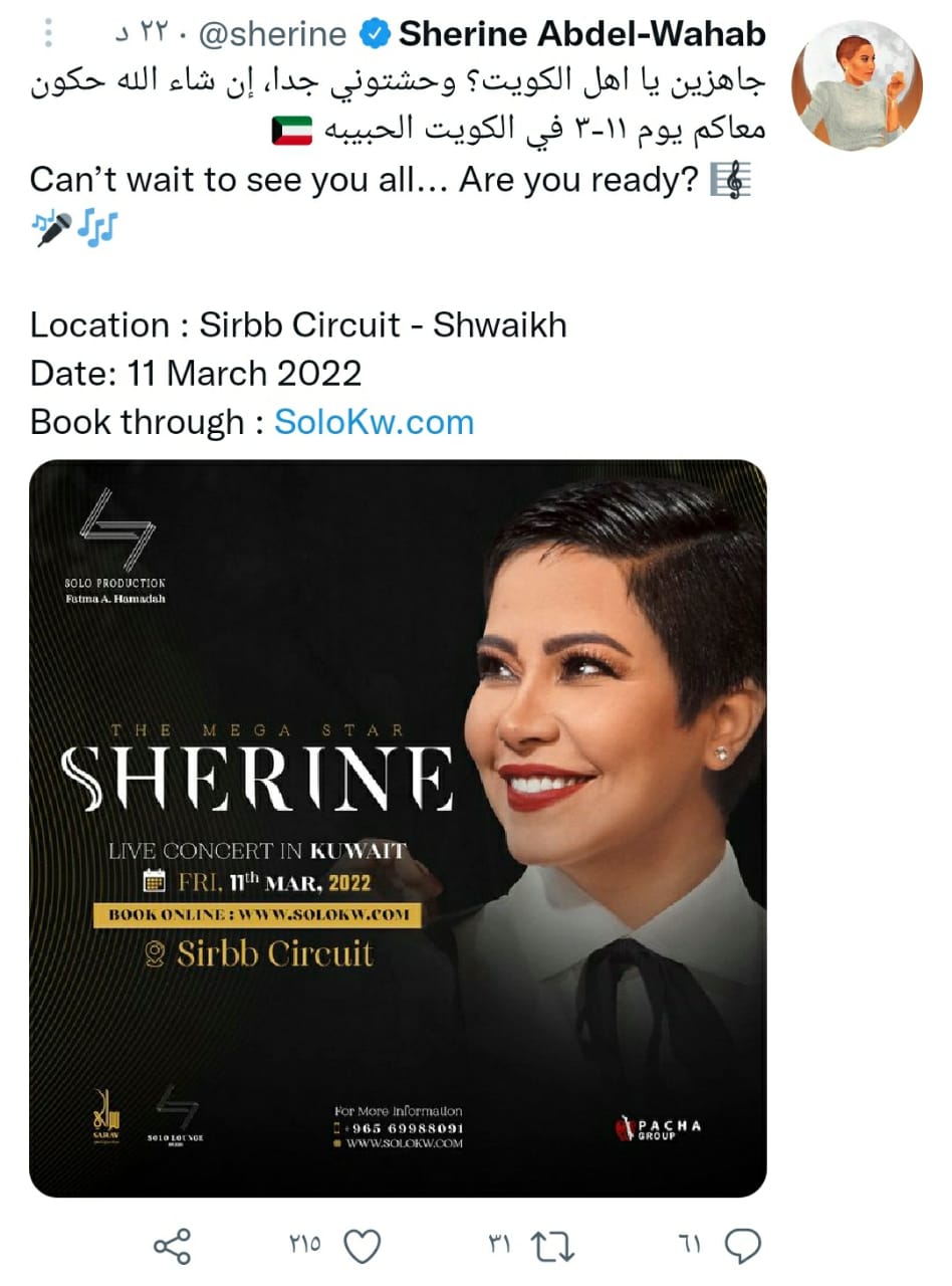 نشرت شيرين عبد الوهاب على حسابها الشخصي بـ تويتر تويته، تقول بها: جاهزين يا أهل الكويت؟ وحشتوني جدًا إن شاء الله حكون معاكم يوم 3ـ 11 في الكويت الحبيبة.