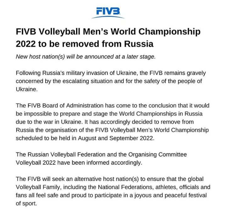 ونشر الاتحاد في بيان رسمي، منذ قليل: بطولة العالم للكرة الطائرة 2022 سيتم سحبها من روسيا، وسيتم الإعلان عن الدولة البديلة المضيفة الجديدة في أقرب وقت.