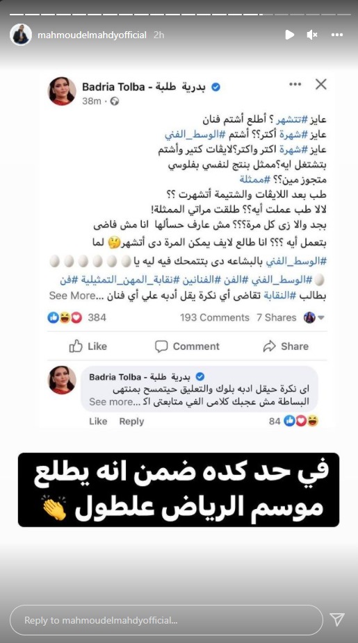 ورد عليها محمود المهدي عبر خاصية ستوري لحسابه الشخصي على انستجرام: في حد كده ضمن إنه يطلع موسم الرياض علطول.