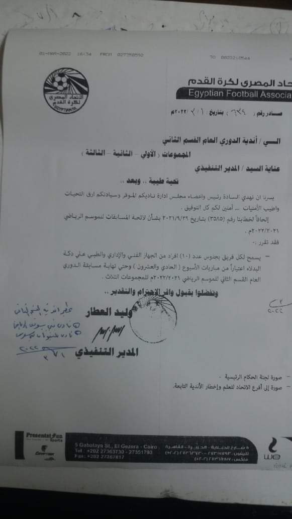 وتضمن الخطاب أنه تقرر السماح لكل فريق بجلوس عدد 10 افراد من الجهاز الفني والإداري والطبي على دكة البدلاء اعتبارا من مباريات الأسبوع 21 وحتى نهاية مسابقة الدوري العام القسم الثاني للموسم الرياضي 2021/2022 بالثلاث مجموعات.