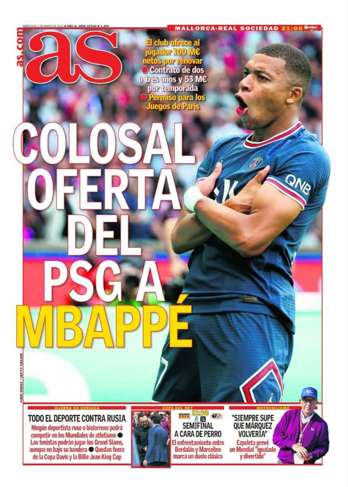 سلطت الصحيفة الضوء على عرض باريس سان جيرمان التاريخي، لتمديد عقد مبابي في الفترة المقبلة، ليصبح الأعلى أجرًا في تاريخ كرة القدم، وذلك براتب سنوي 100 مليون يورو بعيدًا عن الضرائب.