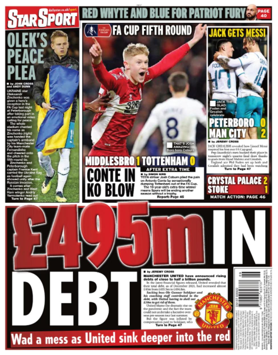 عنونت ستار سبورت في غلافها بـ مانشستر يونايتد غارق في الديون، وذلك بعد دخوله منطقة الخطر بمبلغ يصل 495 مليون يورو.