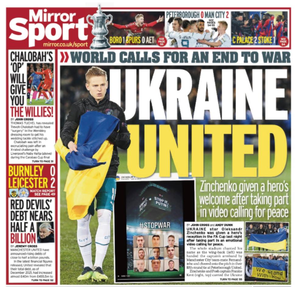 عنونت ميرور في غلافها بـ أوكرانيا المتحدة، وذلك بعد الدعم الذي تحصل عليه زينشينكو أمس وحصوله على شارة القيادة لفريقه وتنازل فرناندينو عنها.