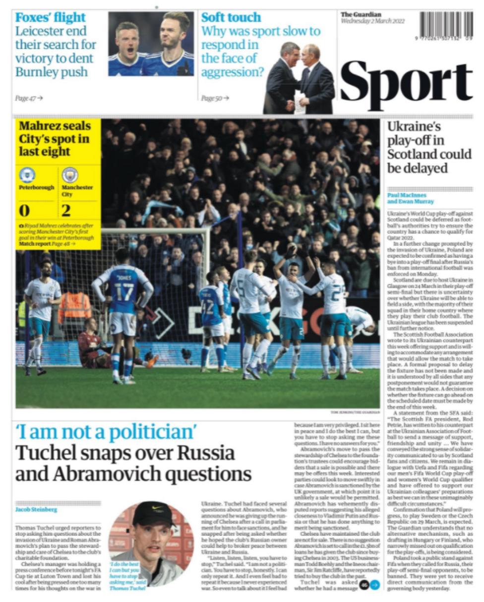 عنونت جارديان، بتصريحات توماس توخيل في صفحة الغلاف، وذلك بعد انفعاله في المؤتمر الصحفي قائلًا: أنا لست سياسيًا، عقب الأسئلة المتكررة بشأن أبراموفيتش وروسيا.