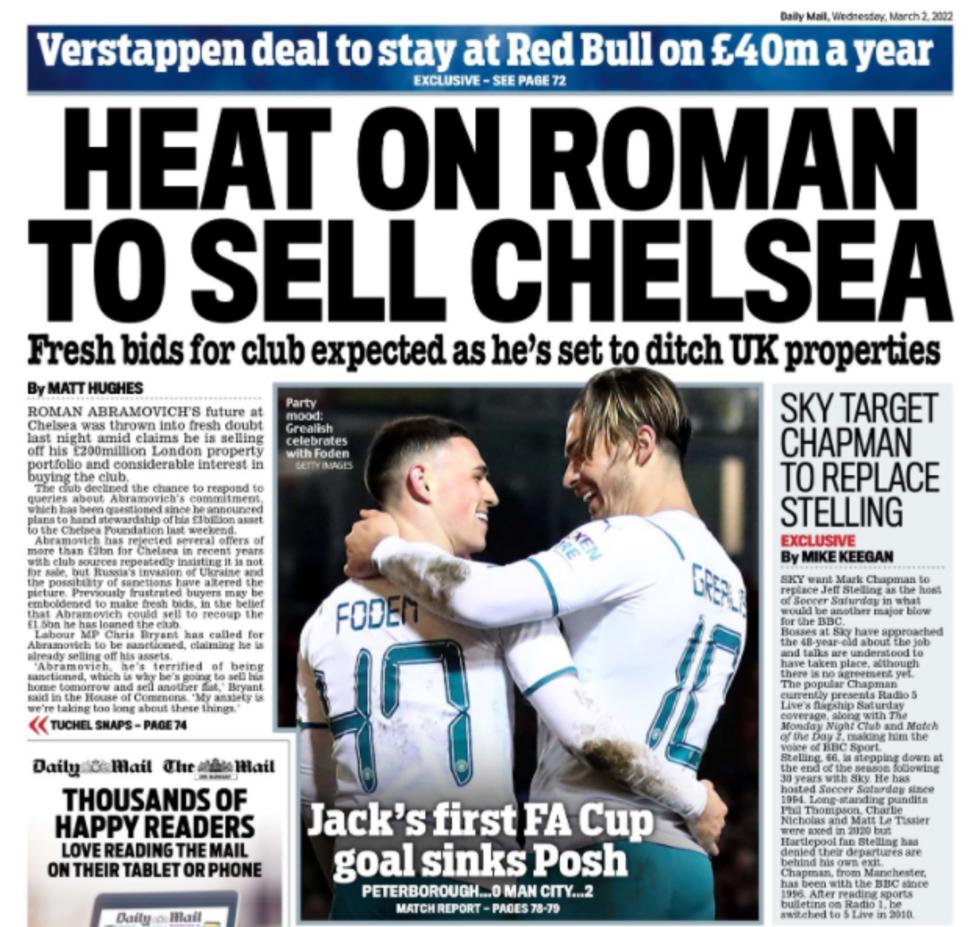 أشارت الصحيفة في غلافها إلى فوز مانشستر سيتي أمس بكأس الاتحاد الإنجليزي مع تألق جريليتش وفيل فودين، كما عنونت بـ" حرارة أبراموفيتش لبيع تشيلسي".
