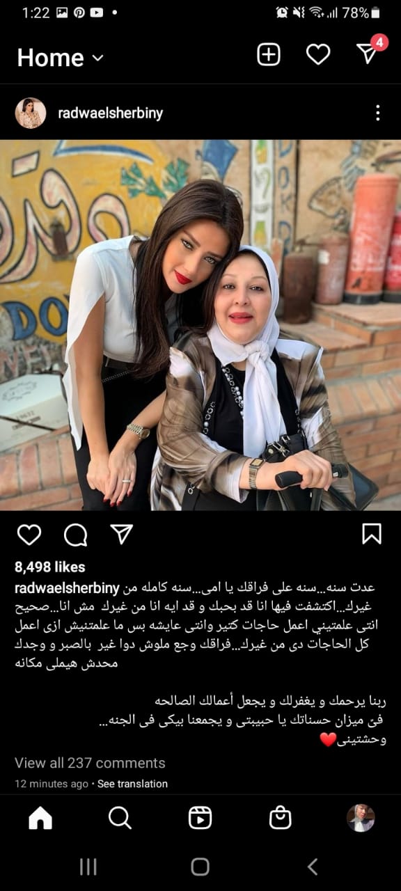ونشرت رضوى الشربيني صورة تجمعها بوالدتها الراحلة، عبر حسابها الرسمي بموقع تبادل الصور والفيديوهات القصيرة انستجرام، معلقة عليها: عدت سنة، سنة على فراقك يا أمي، سنة كاملة من غيرك، اكتشفت فيها أنا قد إيه بحبك، وقد إيه أنا من غيرك مش أنا.