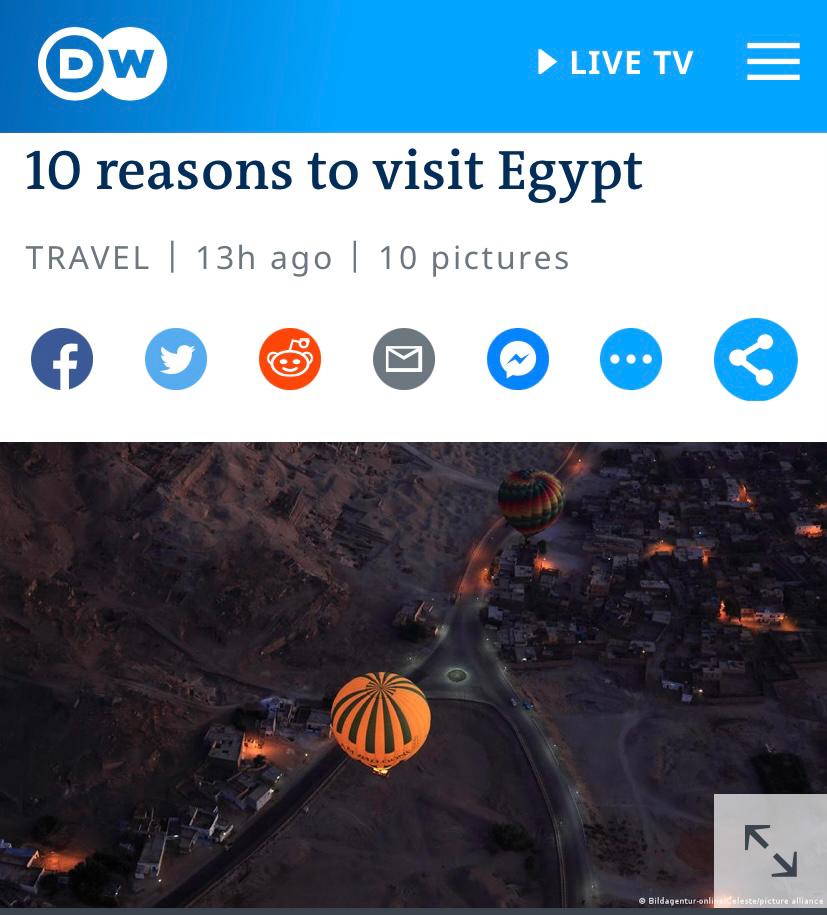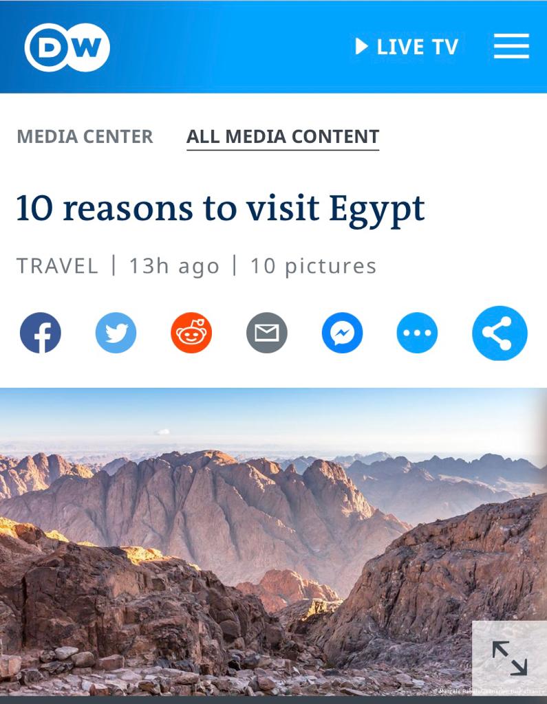 نشر موقع دويتشه فيله الألماني الشهير، تقريرا مصورا اختار خلاله أفضل 10 أماكن سياحية في مصر، تستحق الزيارة تحت عنوان: عشرة أسباب لزيارة مصر.