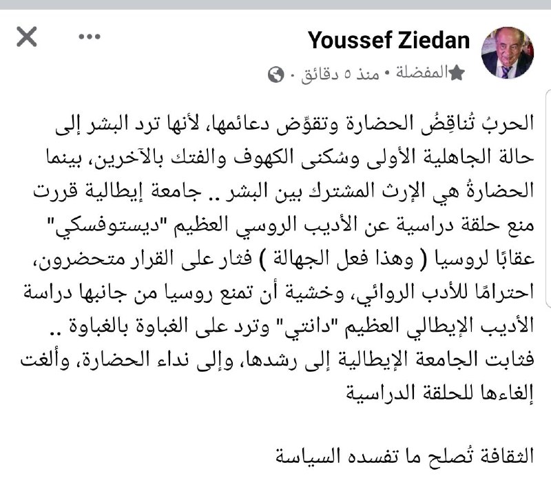 وعبَّر زيدان عن سعادته بالقرار، قائلا: جامعة إيطالية قررت منع حلقة دراسية عن الأديب الروسي العظيم ديستوفسكي؛ عقابًا لروسيا (وهذا فعل الجهالة)؛ فثار على القرار متحضرون، احترامًا للأدب الروائي، وخشية أن تمنع روسيا من جانبها دراسة الأديب الإيطالي العظيم- دانتي، وترد على الغباوة بالغباوة؛ فثابت الجامعة الإيطالية إلى رشدها، وإلى نداء الحضارة، وألغت قرار إلغاءها للحلقة الدراسية.. الثقافة تُصلح ما تفسده السياسة.