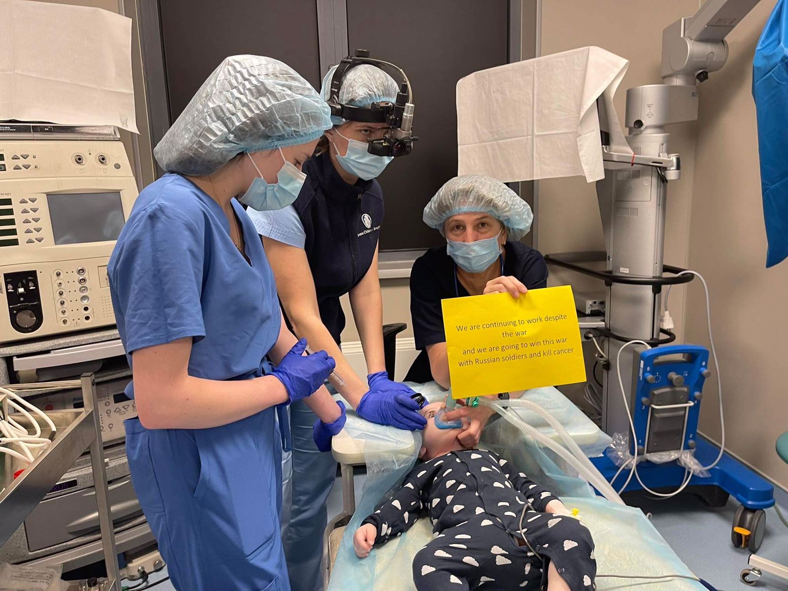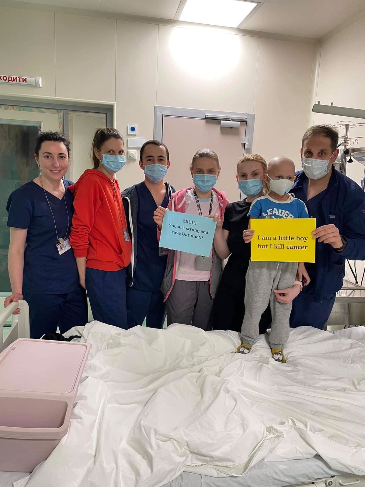 تظهر لقطات الصور والفيديو من داخل مستشفى أخماديت في كييف أطباء يحملون لائحات تحمل عبارة: "نحن مستمرون في العمل بالرغم من الحرب وسننتصر في هذه الحرب مع الجنود الروس ونقتل السرطان".