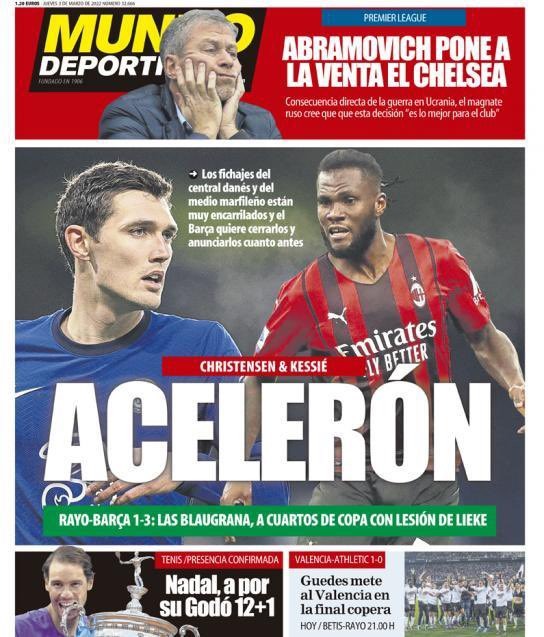 كشفت الصحيفة في غلافها عن تطورات صفقات نادي برشلونة في الصيف، وذلك تحت عنوان السرعة، حيث أكدت أن مفاوضات التعاقد مع المدافع الدنماركي كريستينسين ولاعب خط الوسط الإيفواري فرانك كيسي تسير بشكل جيد.