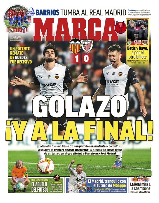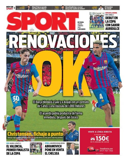 تصدر الثنائي بابلو جافي ورنالد أراخو غلاف سبورت لعدد اليوم، وذلك تحت عنوان: نعم، حيث قالت الصحيفة في غلافها إن برشلونة سيحمي جافي وأراوخو بعقد مدته 5 سنوات، وشرط بقيمة مليار يورو ويمكن أن يتم الاتفاق على الفور بعد الكلاسيكو.