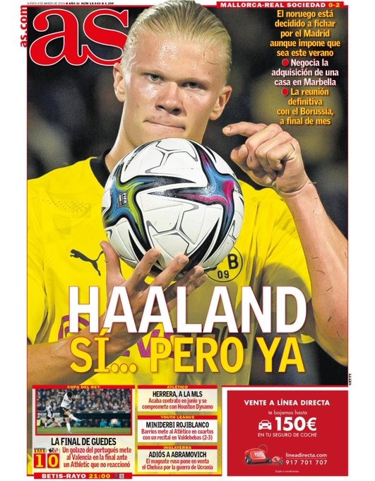عنونت آس في غلافها بـ هالاند يقول نعم لريال مدريد، حيث قالت الصحيفة إن القناص النرويجي مصمم على التوقيع لمدريد، على الرغم من أنه يفرض ذلك هذا الصيف.