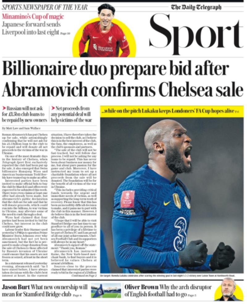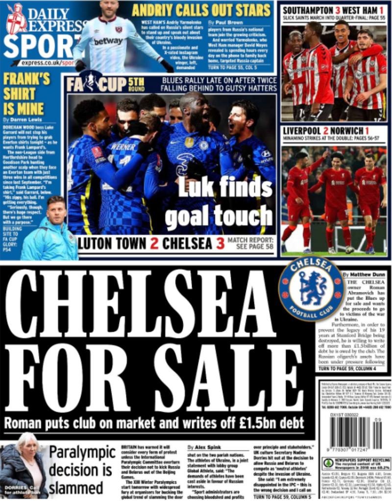 عنونت إكسبريس بـ تشيلسي للبيع، وذلك بعد قرار رومان أبراموفيتش الأخير ببيع النادي، وذلك برسالة وداعية نشرها أمس لجماهير تشيلسي بعد حقبة استمرت 19 عامًا.