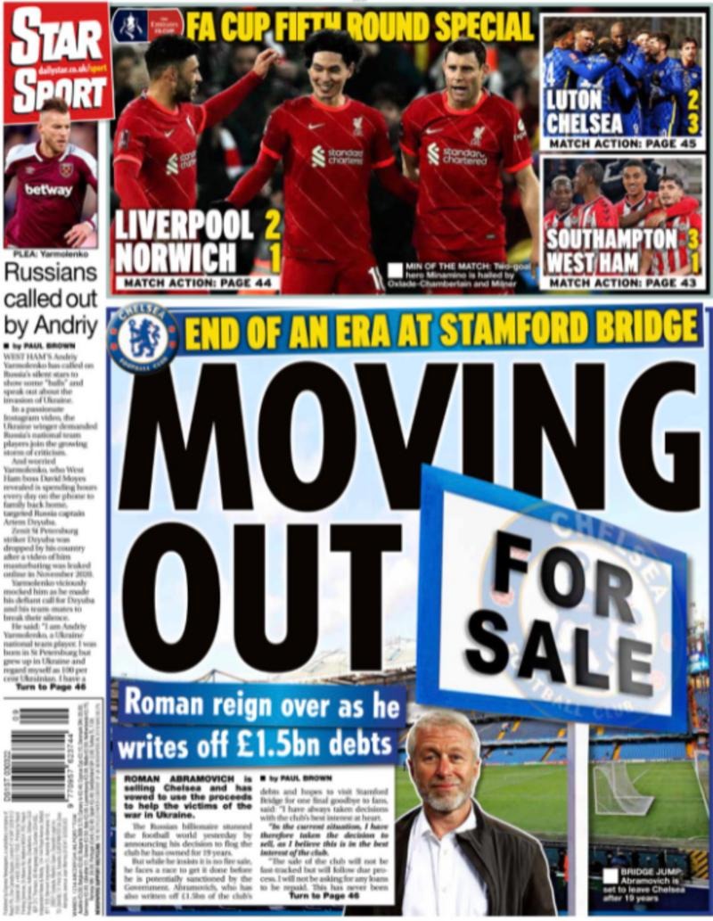 تصدرت صورة لـ لافتة تحمل عنوان للبيع، غلاف صحيفة ديلي ستار لعدد اليوم، حيث سلطت الضوء على قرار أبراموفيتش ببيع تشيلسي بعد أزمة حرب روسيا وأوكرانيا.