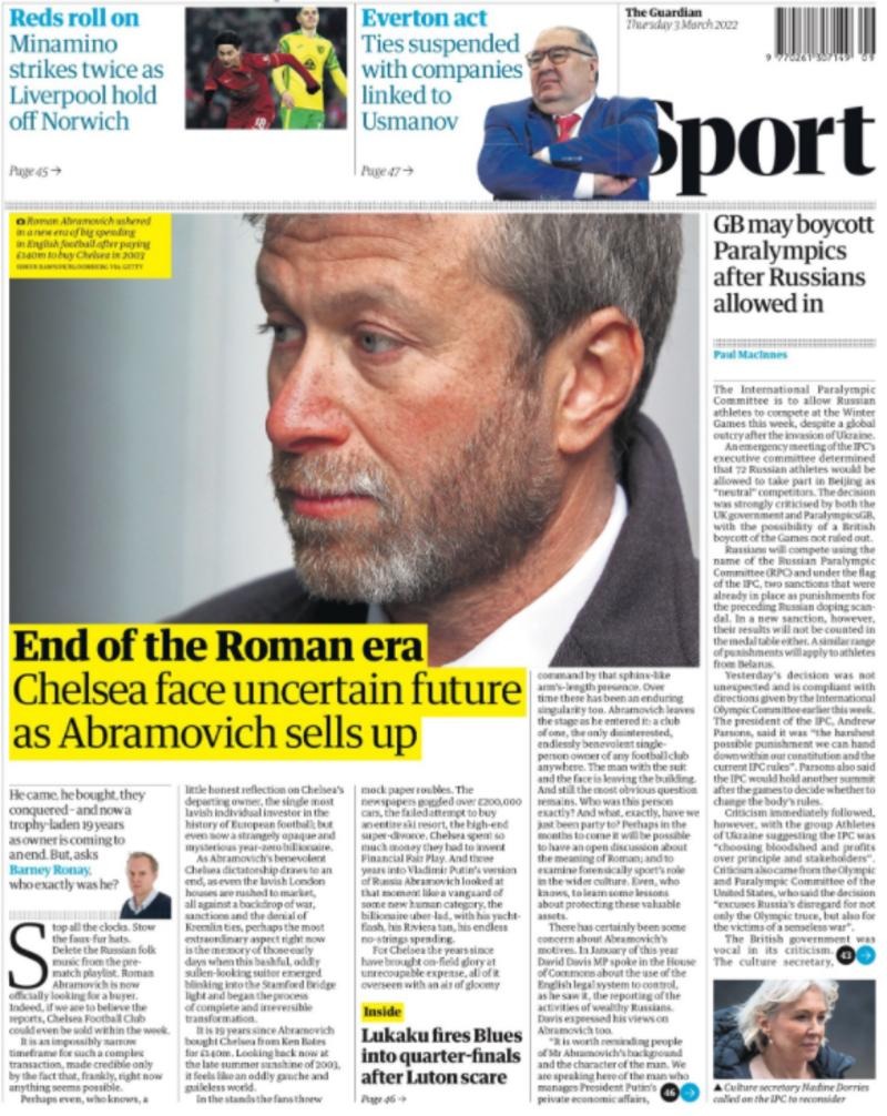 عنونت جارديان في غلافها بـ نهاية عصر أبراموفيتش، حيث سلطت الضوء على بيع أبراموفيتش نادي تشيلسي في الوقت الحالي.