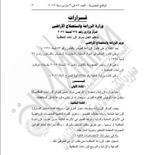 نشرت جريدة الوقائع المصرية، اليوم الخميس 3 مارس 2022، قرارًا وزاريًا بإنشاء مركز الزراعات التعاقدية وبدء العمل به، وجاء نص القرار كالتالي: