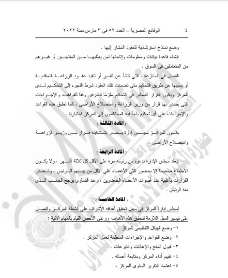 وأضافت الجريدة أن ذلك يكون بموجب قرار وزاري رقم 224 لسنة 2021، بتنظيم العمل بمركز الزراعات التعاقدية، وبعد الاطلاع على قانون الزراعة الصادر بالقانون رقم 53 لسنة 1966 1، وعلى قانون التحكيم في المواد المدنية والتجارية الصدر بالقون رفـع 27 لسنة 1994، وعلى قرار رئيس الجمهورية بالقانون رقم 14 لسنة 2015 بإنشاء مركز الزراعات التعاقدية.