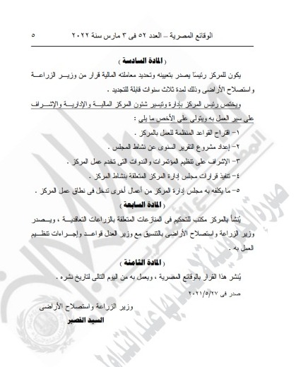 وأكد القرار الوزاري، أنه يجب أن يكون للمركز رئيسا يصدر بتعينه وتحديد معاملته المالية قرار من وزير الزراعة واستصلاح الأراضي، وذلك لمدة ثلاث سنوات قابلة للتجديد.