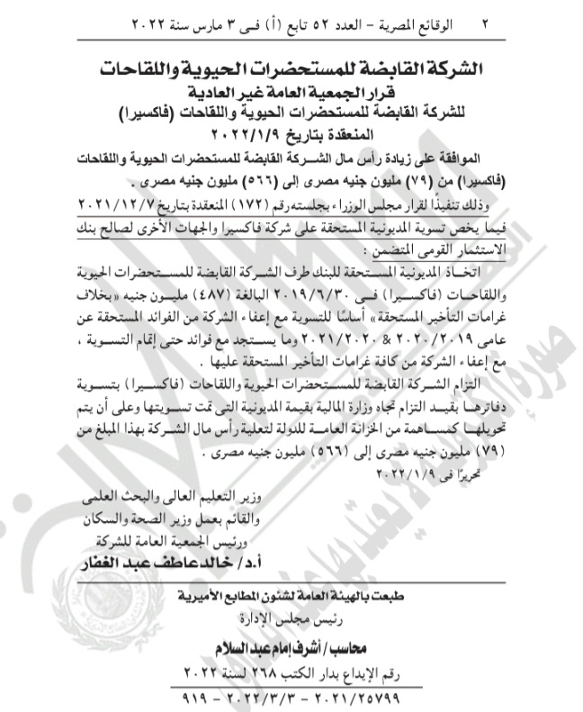 - التزام الشركة القابضة للمستحضرات الحيوية واللقاحات فاکسيرا، بتسوية دفاترها بقيد التزام تجاه وزارة المالية بقيمة المديونية التي تمت تسويتها وعلى أن يتم تحويلها كمساهمة من الخزانة العامة للدولة، لتعلية رأس مال الشركة بهذا المبلغ من 79 مليون جنيه مصرى إلى 566 مليون جنيه مصرى.