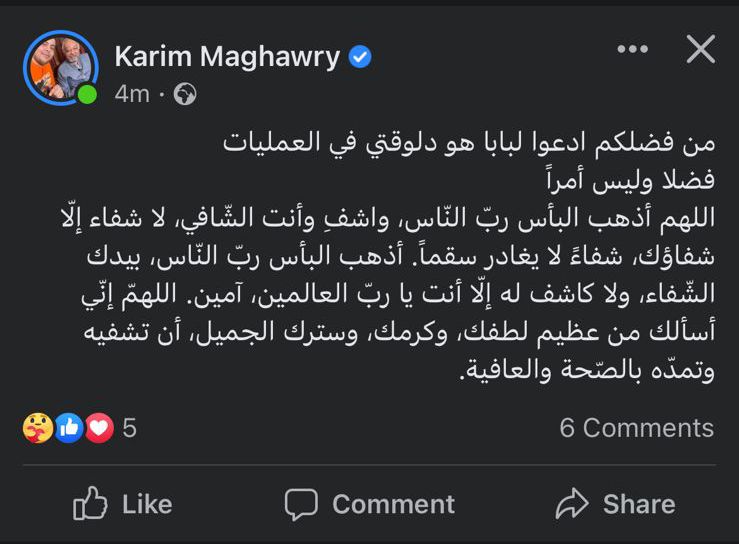 وكتب كريم مغاوري، منشورًا عبر حسابه الشخصي بموقع التواصل الاجتماعي فيسبوك، قائلًا: من فضلكم ادعوا لبابا هو دلوقتي في العمليات.. فضلا وليس أمرا.