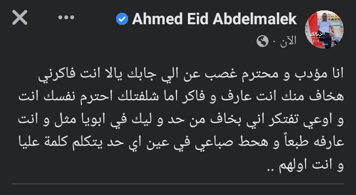 وقال عيد عبد الملك على حسابه الرسمي، عبر موقع التواصل الاجتماعي، فيسبوك: أنا مؤدب ومحترم غصب عن اللي جابك، يالا أنت فاكرني هخاف منك، أنت عارف وفاكر أما شلفتلك، احترم نفسك أنت، وأوعى تفتكر إني بخاف من حد وليك في أبويا مثل، وأنت عارفه طبعا، وهحط صباعي في عين أي حد يتكلم كلمة عليا وأنت أولهم.
