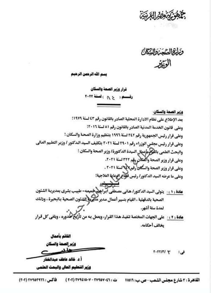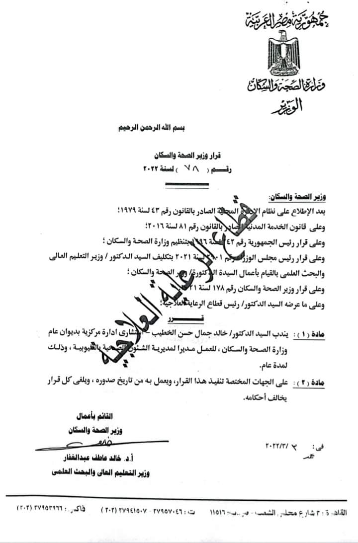- ندب الدكتور خالد جمال حسن الخطيب استشاري إدارة مركزية بديوان عام وزارة الصحة والسكان، للعمل مديرًا لمديرية الشئون الصحية بالقليوبية، وذلك لمدة عام.