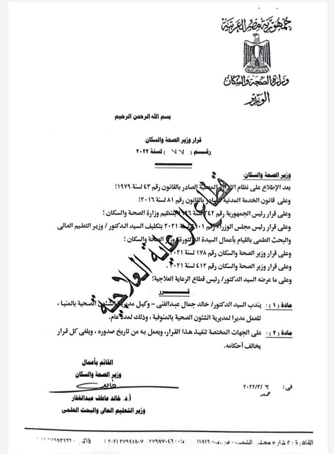 - ندب الدكتور خالد جمال عبد الغني - وكيل مدير الصحية بالمنيا للعمل مديرًا لمديرية الشئون الصحية بالمنوفية، وذلك لمدة عام.