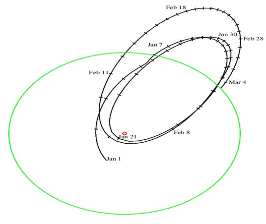تابع القاضي: الاشكال المرفقة توضح مسار حسابي للجسم من يوم 1 يناير 2022 وحتى 4 مارس 2022 وكذلك المكان المتوقع لسقوطه على الوجه المظلم للقمر والذى سيكون بسرعة 9300كم / ساعة عند خط عرض 5.18 شمال وخط طول 233.55 شرقا وذلك في حوالى الساعة 12:25 بتوقيت جرينتش.