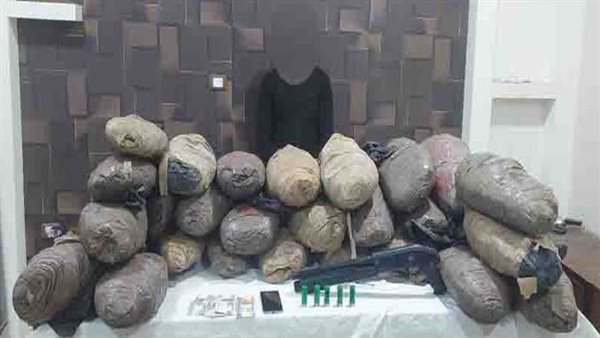 فور التأكد من صحة المعلومات والتحريات بالتنسيق مع قطاع الأمن العام، وعقب تقنين الإجراءات القانونية تمكنت الأجهزة الأمنية من ضبط المتهم وبحوزته كمية من مخدر البانجو وزنت 90 كيلو جرامًا، بالإضافة إلى سلاح ناري (بندقية خرطوش) وعدد من الطلقات لذات العيار، ومبلغ من المال وهاتف محمول.