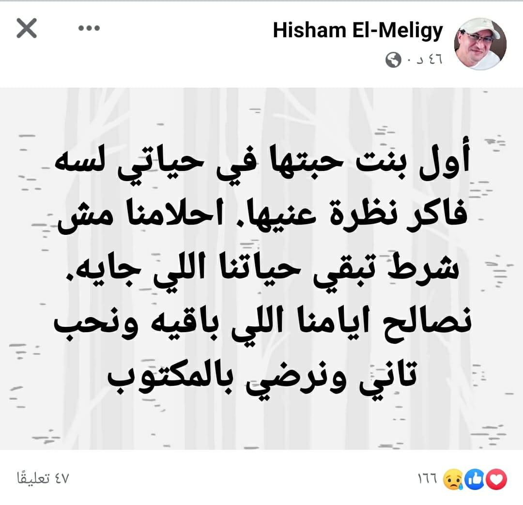 وكتب هشام الميجي منشورًا، عبر حسابه الشخص بموقع تواصل الاجتماعي، قال فيه: أول بنت حبتها في حياتي لسه فاكر نظرة عينها، أحلامنا مش شرط تبقى حياتنا اللي جاية، نصالح أيمانا اللي الباقية، ونحب تاني ونرضى بالمكتوب.