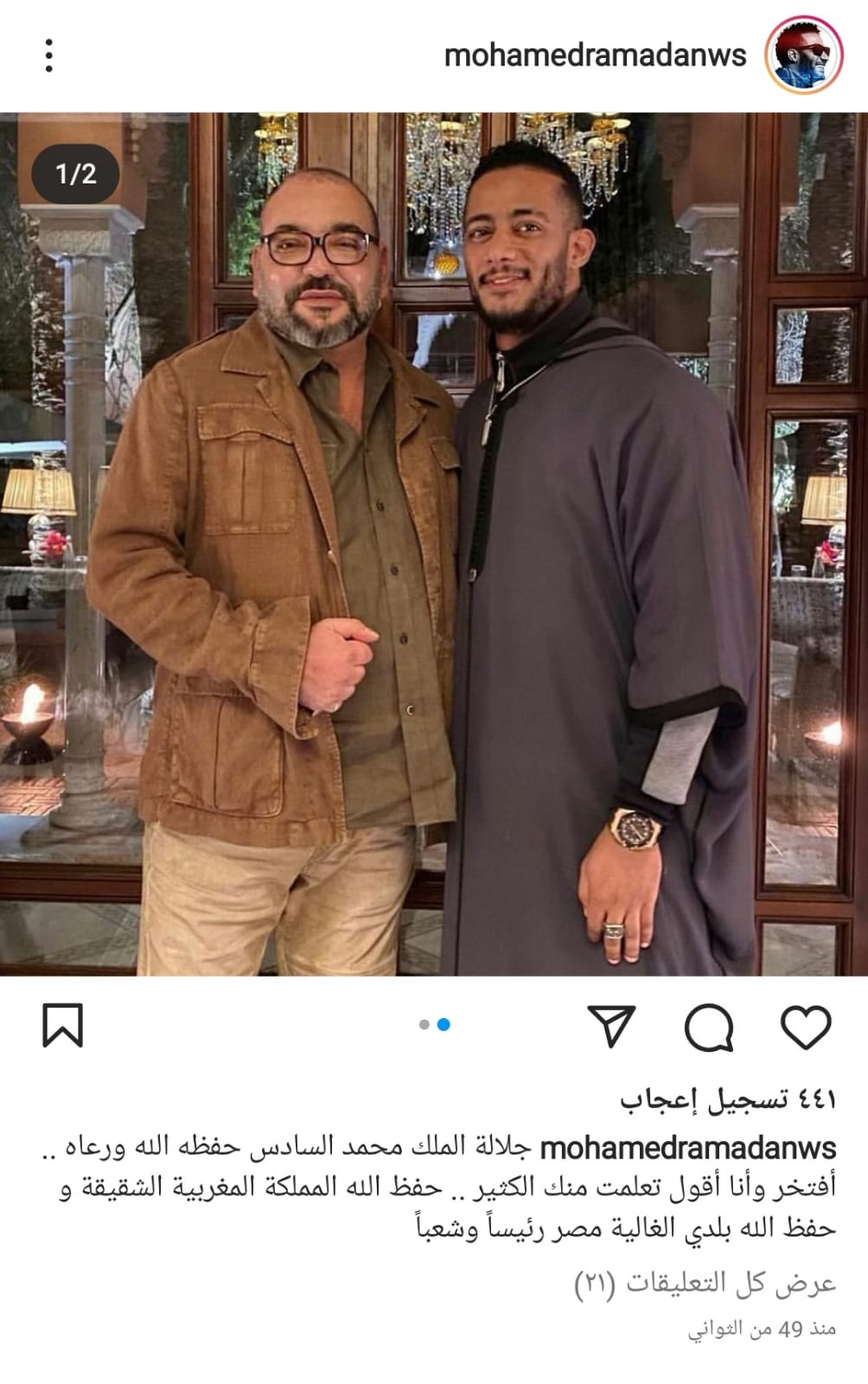 وشارك محمد رمضان جمهوره بصورة له، رفقة الملك محمد السادس، وذلك عبر حسابه الشخصي بموقع تبادل الصور والفيديوهات القصيرة، انستجرام، معلقا: جلالة الملك محمد السادس حفظه الله ورعاه، أفتخر وأنا أقول تعلمت منك الكثير.. حفظ الله المملكة المغربية الشقيقة، وحفظ الله بلدي الغالية مصر رئيسًا وشعبًا.