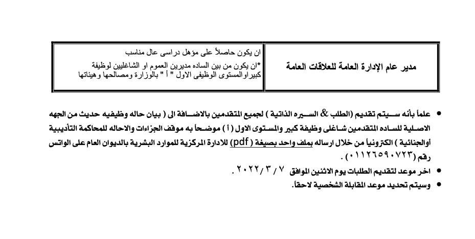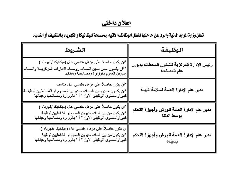 كما كشفت وزارة الري، حاجتها لمدير عام للإدارة العامة لسلامة البيئة، ويجب أن يكون حاصلا على مؤهل هندسي عال مناسب، كما يجب أن يكون من بـين مديرين العموم أو الشاغلين لوظيفـة كبير والمستوى الوظيفي الأول أ، بالوزارة ومصالحها وهيئاتها.
